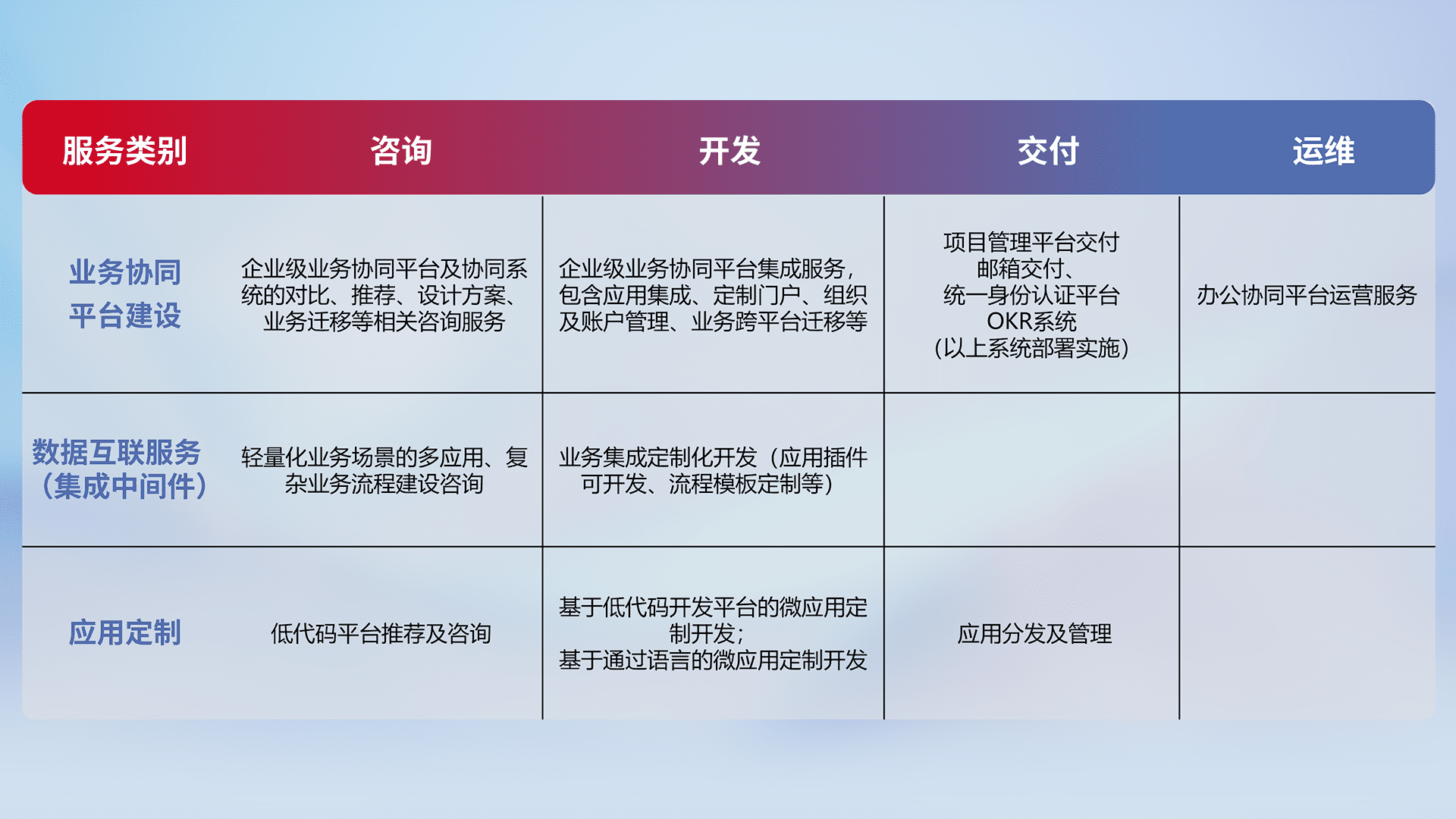 针对钉钉、、、、企微、、IDaas等平台级产品提供产品的规划、、、、方案、、交付、、、定制化开发等服务,,,实现如统一协同办公、、、智能客户服务、、、混合会议管理、、、智能数据查询、、等业务场景,,实现数字化转型。。。